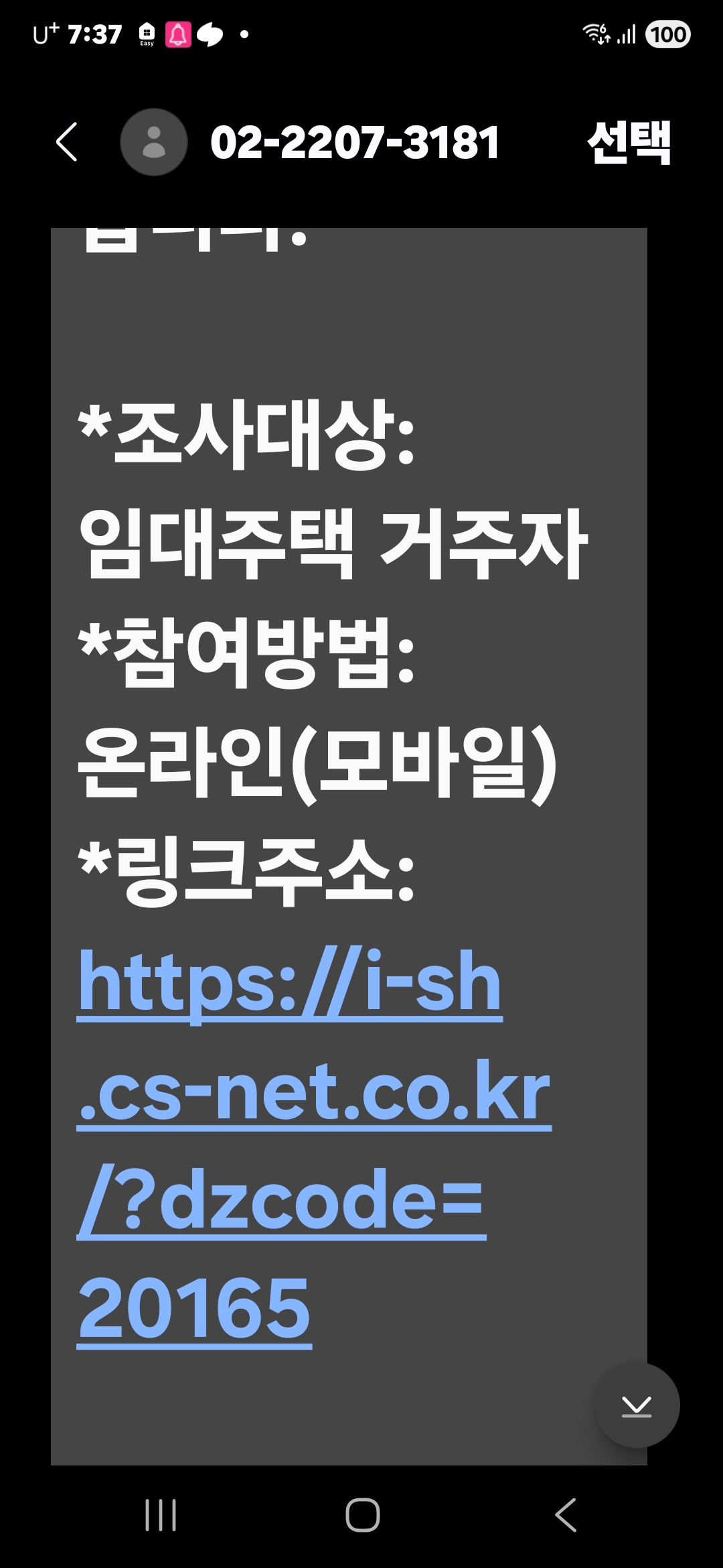 - 설문 링크가 **정식 SH공사 설문 시스템(cs-net.co.kr)**을 사용하는 것으로 보이나, 피싱 문자일 가능성도 있으므로 링크 클릭 전 다음 사항을 확인하세요: