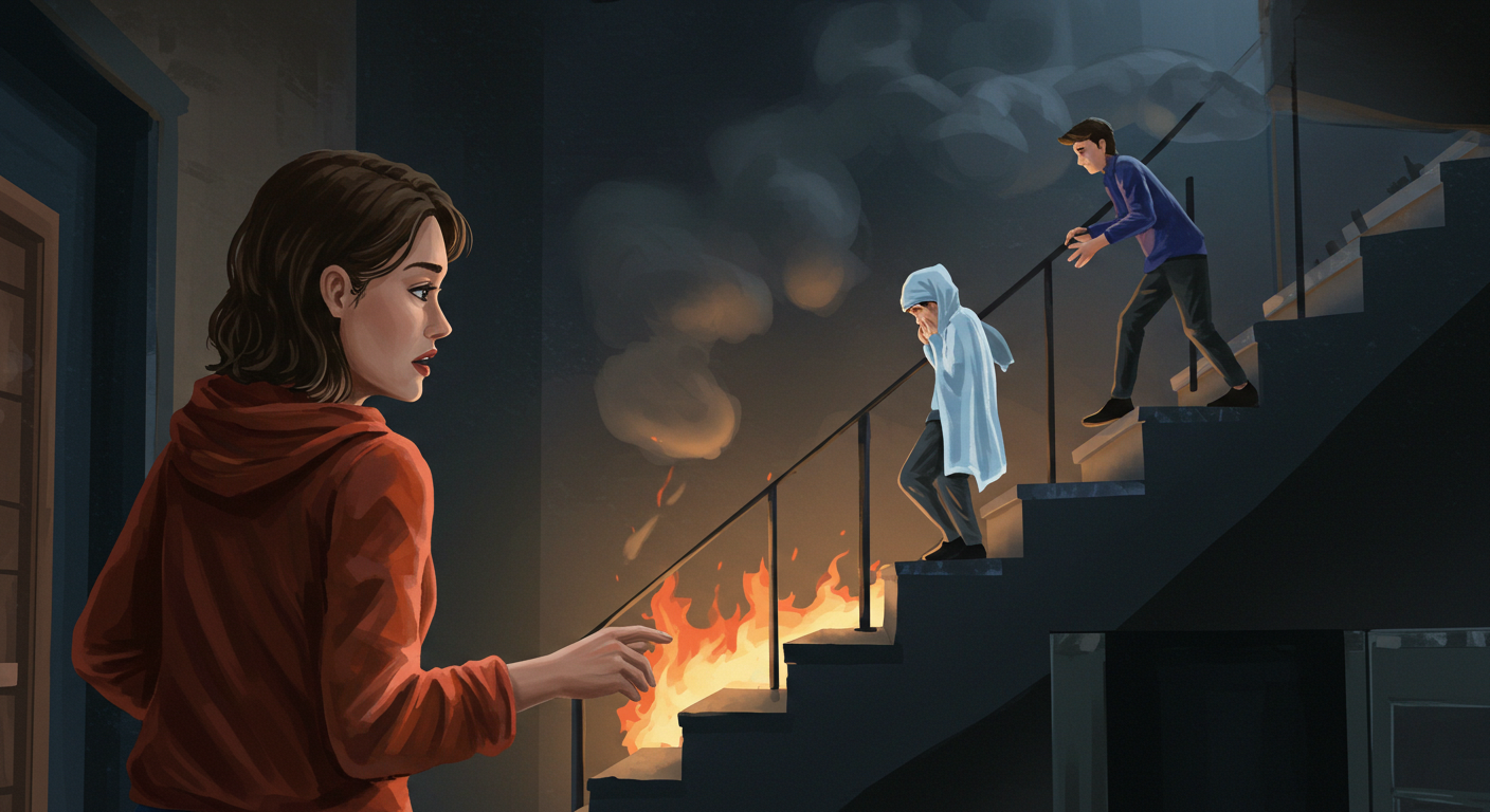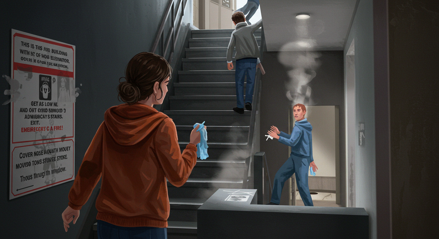 불길 속을 억지로 돌파하려 계단으로 뛰어내림 → 연기 흡입 + 화상 위험 큼.